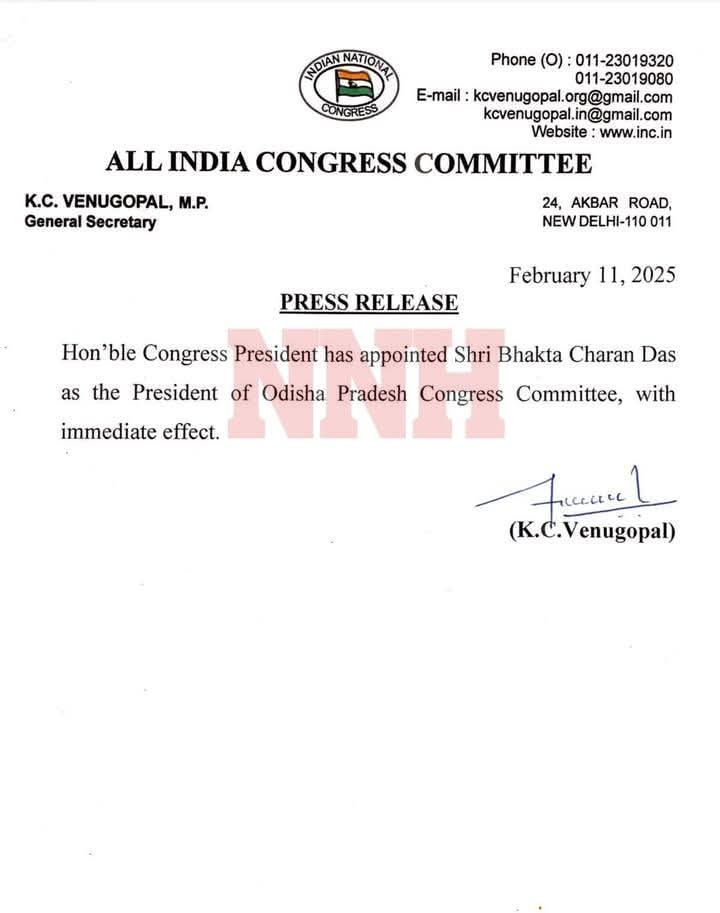 NNH रायपुर/ इंडियन नेशनल कांग्रेस ने भक्त चरणदास को उड़ीसा कांग्रेस कमेटी का अध्यक्ष नियुक्ति किया है।पार्टी महासचिव केसी वेणुगोपाल ने इस आशय का पत्र जारी किया है, जिसमें कहा गया है कि पार्टी के राष्ट्रीय अध्यक्ष मल्लिकार्जुन खरगे ने इस पद पर उनकी नियुक्ति की है।