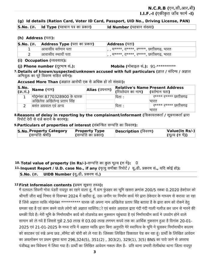 इसके बाद 30 जनवरी को अखिलेश प्रताप सिंह ने मौके पर काम बंद करवा दिया, रितेश कुमार महतो का आरोप है कि फिर उसी रात को अज्ञात व्यक्तियों के साथ कथित एक व्यक्ति गुढिय़ारी निवासी बसंत अग्रवाल ने मौके पर मजदूरों, और मिस्त्री रामेश्वर निषाद के साथ गाली गलौज कर काम बंद करने के लिए धमकी दी, और उसी रात को कुछ अज्ञात लोग मोके पर पहुंचे और वहां काम करने वाले मजदूरों को झूठे केस में फंसाने की धमकी देकर तोडफ़ोड़ कर निर्माणाधीन कार्य में उपयोग होने वाले लगभग 2.50 लाख से 03.00 लाख का सामान कालम को काटकर एवं रखे अन्य छड़ सीमेंट को चोरी को ले गए है। जिसके बाद रितेश कुमार महतो ने रायपुर के थाना तेलीबांधा में शिकायत दर्ज कराई है।