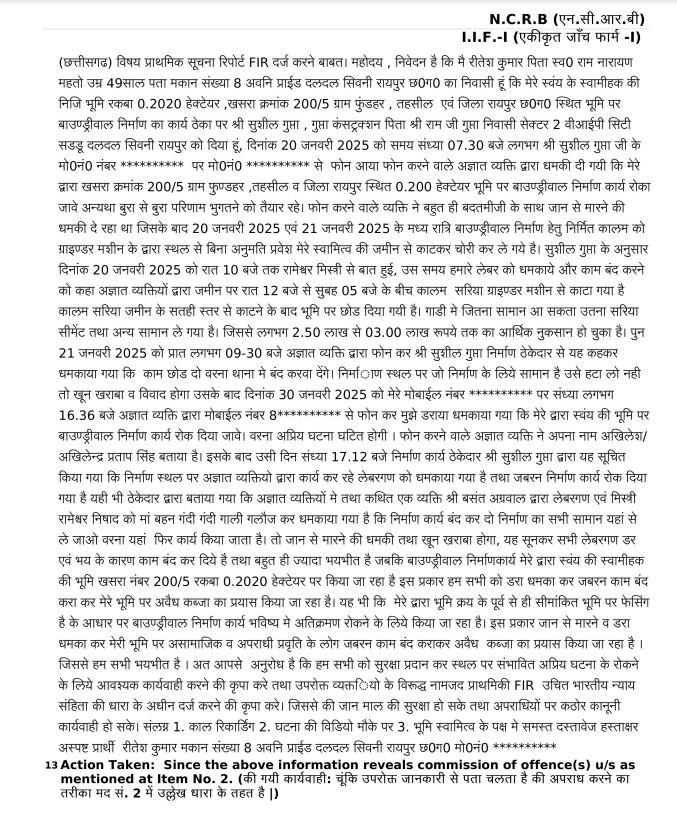 रितेश कुमार महतो ने अपनी शिकायत में पुलिस को बताया है कि रायपुर के वीआईपी रोड ग्राम फुंडहर में उसकी 0.2020 हेक्टेयर भूमि है जिसे उसने जीरा बाई निषाद से दिसम्बर 2024 में खरीदी थी। उसी भूमि पर बाउंड्रीवाल निर्माण कराया जा रहा था। जिसके निर्माण की जिम्मेदारी ठेकेदार सुशील गुप्ता को सौंपी गई थी। पहले तो ठेकदार सुशील गुप्ता के मोबाइल पर किसी अज्ञात व्यक्ति ने फोन किया, फिर 21 जनवरी को अखिलेश प्रताप सिंह ने फोन कर ठेकेदार सुशील गुप्ता को धमकाया कि काम छोड़ दे वरना थाने मे बंद करवा देंगे। निर्माण स्थल पर जो निर्माण के लिये सामान है उसे हटा लो वरना खून खराबा व विवाद होगा। जिसके बाद 30 जनवरी को रितेश कुमार महतो को भी अज्ञात मोबाईल नंबर से कॉल आया जिसमें वह अज्ञात व्यक्ति रितेश को जान से मारने की धमकी दी।