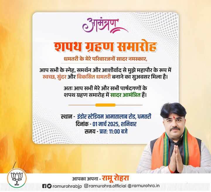 महापौर रोहरा ने कहा कि आप सभी के स्नेह, समर्थन और आशीर्वाद से मुझे महापौर के रूप में स्वच्छ, सुंदर और विकसित धमतरी बनाने का सुअवसर मिला है। अतः आप सभी मेरे और सभी पार्षदगणों के शपथ ग्रहण समारोह में पधारकर अपना अमूल्य आशीर्वाद प्रदान करें।
