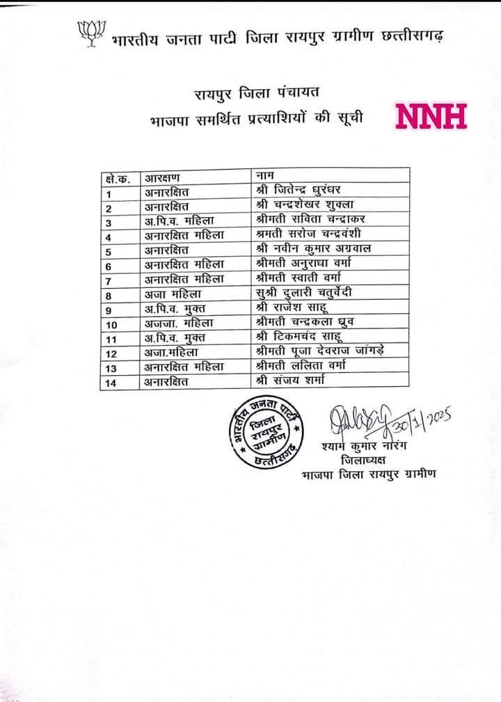 NNH रायपुर/ भारतीय जनता पार्टी ने रायपुर जिला पंचायत के लिए भाजपा समर्थित प्रत्याशियों की सूची जारी कर दी है।