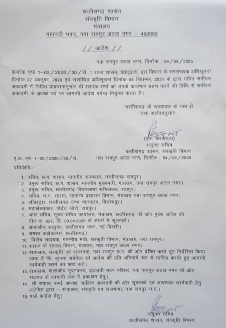 अब छत्तीसगढ़ शासन संस्कृति विभाग के द्वारा जारी संशोधित अधिसूचना में शशांक शर्मा को साहित्य अकादमी का अध्यक्ष नियुक्त कर दिया गया है।