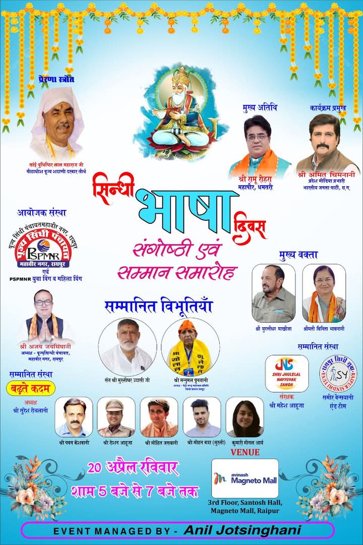 NNH रायपुर/ सिंधी भाषा दिवस के उपलक्ष्य में 20 अप्रैल को मैग्नेटो मॉल रायपुर में सिंधी समाज की विभूतियों का सम्मान किया जाएगा, इसके साथ ही एक संगोष्ठी का भी आयोजन किया जाएगा। यह कार्यक्रम धमतरी के महापौर जगदीश रामु रोहरा के मुख्य आतिथ्य में सम्पन्न होगा।