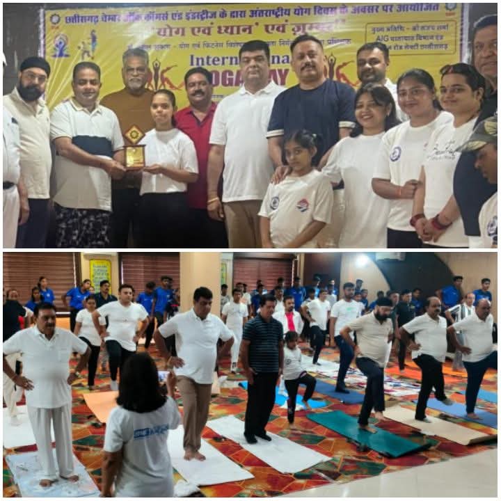 NNH रायपुर/ आज दिनांक 21 जून 2025 को अंतर्राष्ट्रीय योग दिवस के उपलक्ष्य में, चेंबर ऑफ कॉमर्स एंड इंडस्ट्री द्वारा चेंबर भवन में एक दिवसीय योग शिविर का सफल आयोजन किया गया। इस शिविर में यातायात विभाग एवं अध्यक्ष रोड सेफ्टी छत्तीसगढ़ के असिस्टेंट इंस्पेक्टर जनरल श्री संजय शर्मा जी के मुख्य आतिथ्य में बड़ी संख्या में व्यापारिगण एवं आमजनों ने उत्साहपूर्वक भाग लिया, चेंबर प्रतिनिधी मंडल ने मुख्य अतिथि श्री संजय शर्मा जी को पुष्प गुच्छ एवं स्मृति चिन्ह भेंट कर स्वागत किया।