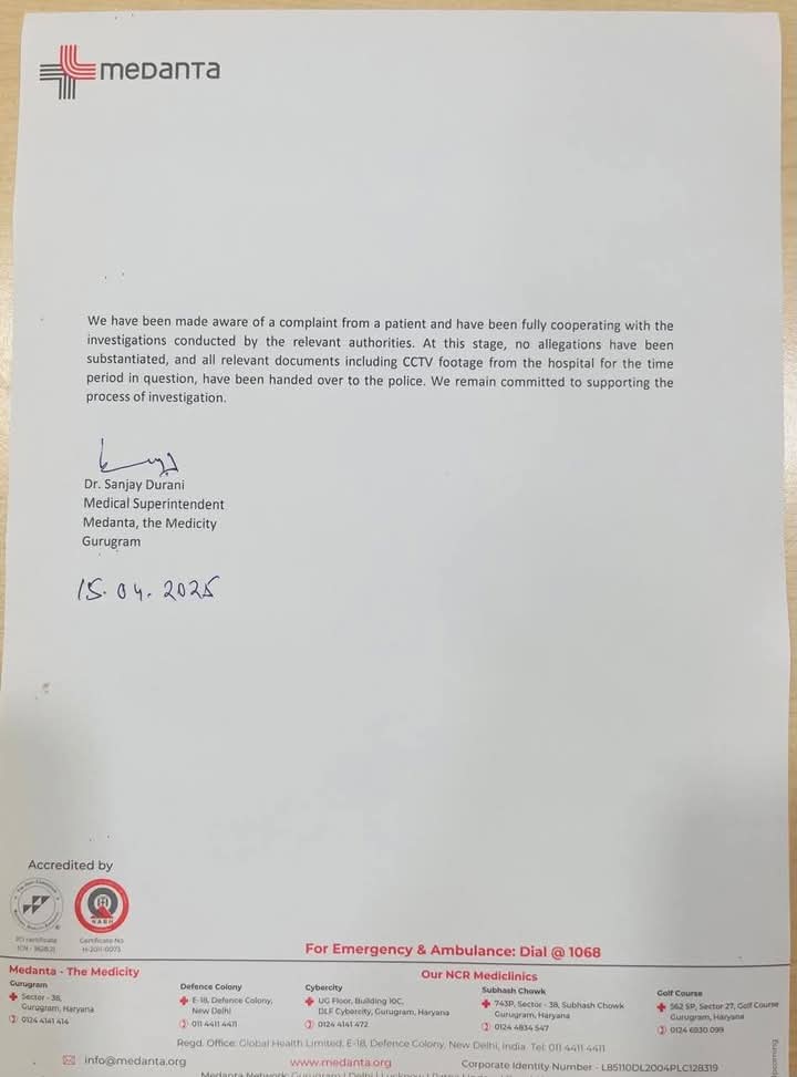 इस मामले में पुलिस की ओर से मजिस्ट्रेट के सामने पीड़िता का बयान दर्ज कराया गया है। पुलिस अस्पताल के CCTV कैमरों की फुटेज खंगाल रही है। ताकि आरोपी की पहचान करके उसे जल्द गिरफ्तार किया जा सके। वहीं मेदांता अस्पताल प्रबंधन ने कहा है कि हम पूरा सहयोग कर रहे हैं, साथ ही पुलिस अधिकारियों को सभी जरूरी दस्तावेज और सीसीटीवी फुटेज मुहैया करा दिए हैं।