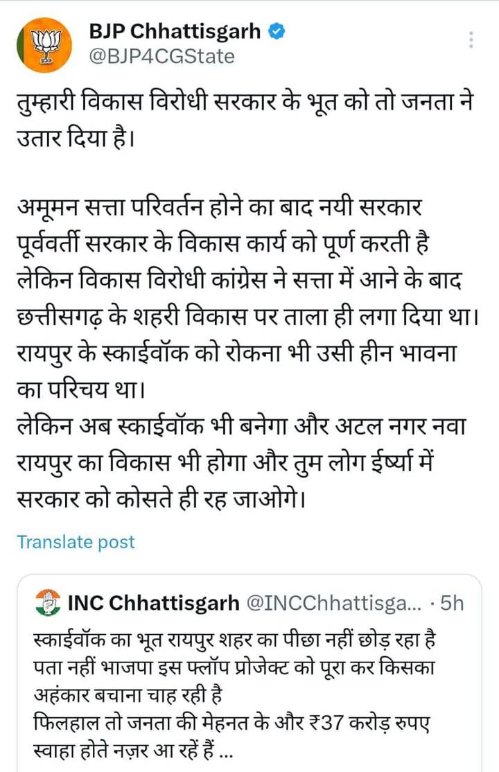 वहीं इस अधूरे निर्माण के लिए राशि की मंजूरी मिलते ही भाजपा-कांग्रेस के बीच सोशल मीडिया पर तीखी बहस देखने को मिल रही है। छत्तीसगढ़ प्रदेश कांग्रेस के x अकाउंट पर एक पोस्ट की गई है जिसमें स्काई वॉक के निर्माण को लेकर तीखी प्रतिक्रिया व्यक्त की गई है। उसमें लिखा गया है कि…