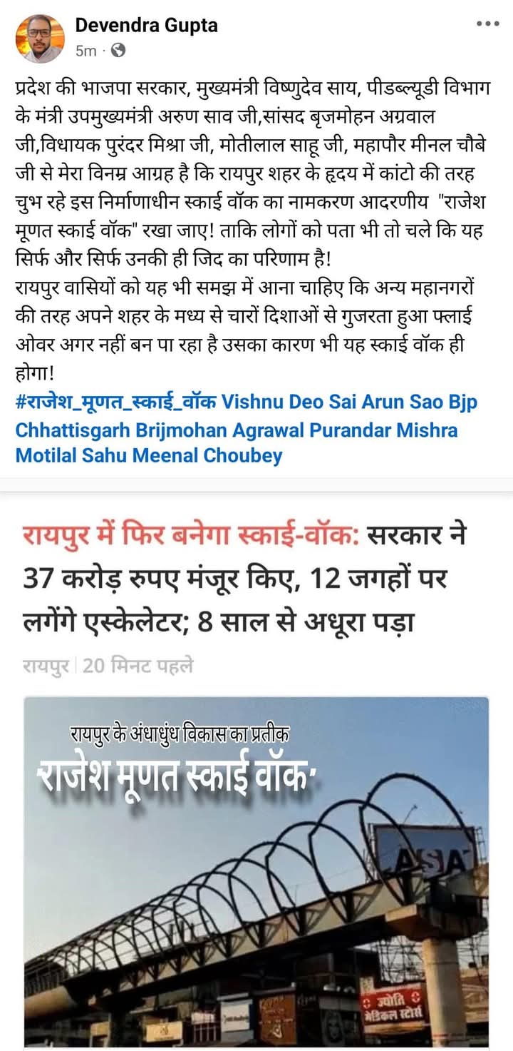 सोशल मीडिया पर सक्रिय रहने वाले देवेंद्र गुप्ता ने अपने फेसबुक पेज पर स्काई वॉक की फोटो शेयर कर एक पोस्ट में स्काई वॉक का नामकरण ही कर दिया है। देवेंद्र ने लिखा है कि प्रदेश की भाजपा सरकार, मुख्यमंत्री विष्णुदेव साय, पीडब्ल्यूडी विभाग के मंत्री उपमुख्यमंत्री अरुण साव जी,सांसद बृजमोहन अग्रवाल जी,विधायक पुरंदर मिश्रा जी, मोतीलाल साहू जी, महापौर मीनल चौबे जी से मेरा विनम्र आग्रह है कि रायपुर शहर के हृदय में कांटो की तरह चुभ रहे इस निर्माणाधीन स्काई वॉक का नामकरण आदरणीय “राजेश मूणत स्काई वॉक” रखा जाए! ताकि लोगों को पता भी तो चले कि यह सिर्फ और सिर्फ उनकी ही जिद का परिणाम है!