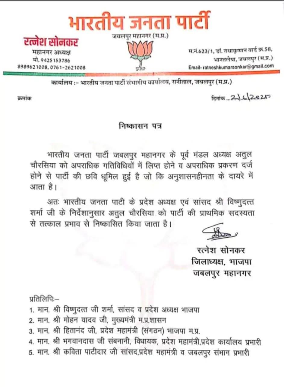 NNH CRIME REPORT/ भाजपा नेता पर असम निवासी युवती से जबरन देह व्यापार करवाने का आरोप लगा है। आरोपी का नाम अतुल चौरसिया है जो अतिथि होटल का संचालक है और भाजपा का पूर्व मंडल अध्यक्ष भी है। आरोपी के चंगुल से छूटी युवती ने आपबीती सुनाते हुए शिकायत की जिस पर पुलिस ने आरोपी को गिरफ्तार कर लिया है। जिसके बाद भाजपा ने अतुल चौरसिया को निष्कासित कर दिया है।