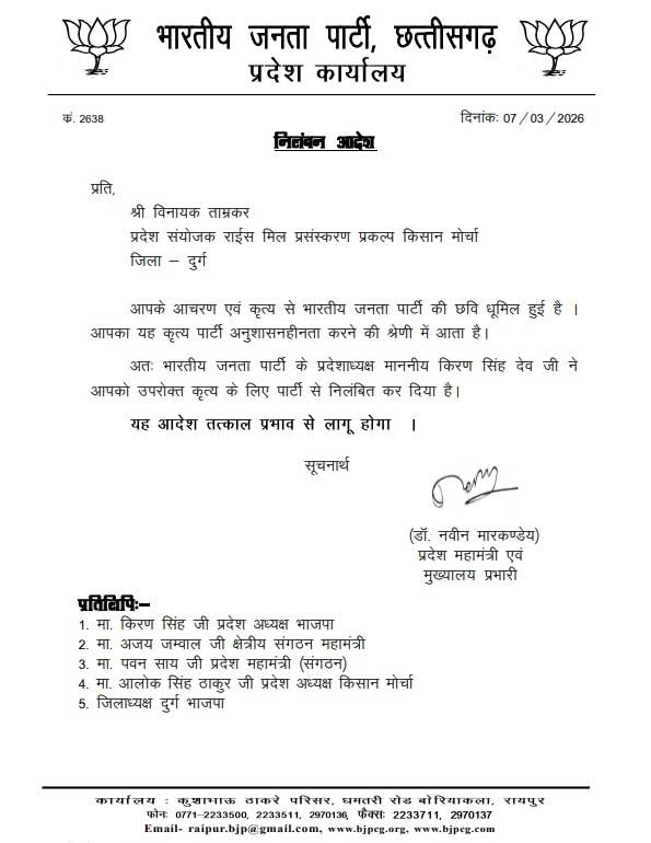 बताया जा रहा है कि यह कृषि भूमि भाजपा किसान मोर्चा राइस मिल प्रसंकरण प्रदेश संयोजक विनायक ताम्रकार की है। वहीं भारतीय जनता पार्टी ने कड़ी कार्रवाई करते हुए विनायक ताम्रकार को पार्टी से निलंबित कर दिया गया है। भाजपा के प्रदेश अध्यक्ष किरण सिंहदेव के निर्देश पर प्रदेश महामंत्री डॉ. नवीन मारकण्डेय ने निलंबन आदेश जारी किया है।