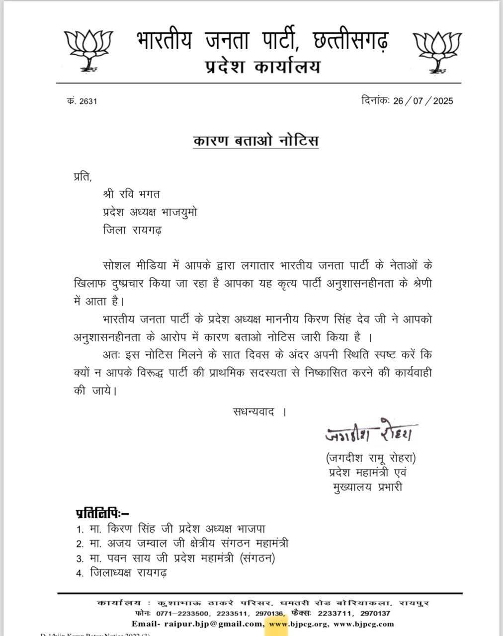 उक्ताशय का पत्र (कारण बताओ नोटिस) प्रदेश महामंत्री “मुख्यालय” रामू रोहरा ने जारी किया है।