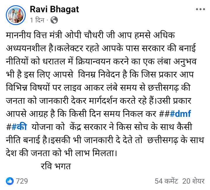 क्रमशः उसी एक पोस्ट पर लिखा कि…माननीय वित्त मंत्री ओपी चौधरी जी आप हमसे अधिक अध्ययनशील है।कलेक्टर रहते आपके पास सरकार की बनाई नीतियों को धरातल में क्रियान्वयन करने का एक लंबा अनुभव भी है इस लिए आपसे विनम्र निवेदन है कि जिस प्रकार आप विभिन्न विषयों पर लाइव आकर लंबे समय से छत्तीसगढ़ की जनता को जानकारी देकर मार्गदर्शन करते रहे हैं।उसी प्रकार आपसे आग्रह है कि किसी दिन समय निकल कर ###dmf ##की योजना को केंद्र सरकार ने किस सोच के साथ कैसी नीति बनाई है।इसकी भी जानकारी दे देते तो छत्तीसगढ़ के साथ देश की जनता को भी लाभ मिलता।