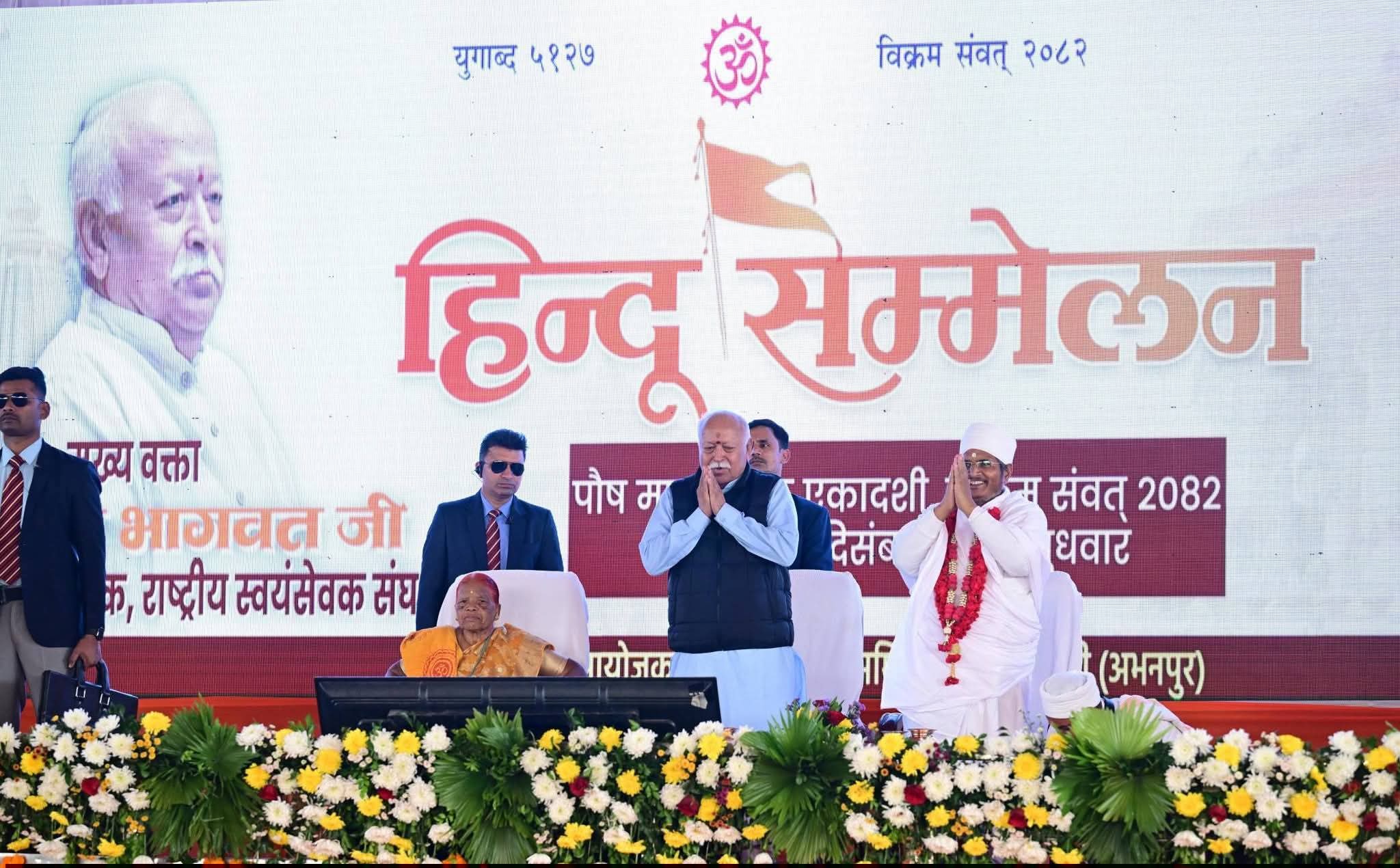 संघ प्रमुख डॉ मोहन भागवत ने विराट हिंदू सम्मेलन में विशाल जनसमूह को सम्बोधित करते हुए कहा कि `भारत एक हिंदू राष्ट्र है और इसके लिए किसी संवैधानिक मुहर की आवश्यकता नहीं है। जब तक इस धरती पर एक भी व्यक्ति भारतीय पूर्वजों के गौरव में विश्वास रखता है, तब तक यह हिंदू राष्ट्र बना रहेगा।’ उन्होंने मंदिर, जल के स्रोत और श्मशान घाटों तक सभी हिंदुओं की समान पहुंच सुनिश्चित करने पर जोर दिया। संघ प्रमुख डॉ. भागवत ने कहा कि यदि हिंदू समाज संगठित और मजबूत रहेगा, तभी वह दुनिया के कल्याण के लिए काम कर पाएगा। उन्होंने “हिंदू जगे तो विश्व जगे” का संदेश दिया।