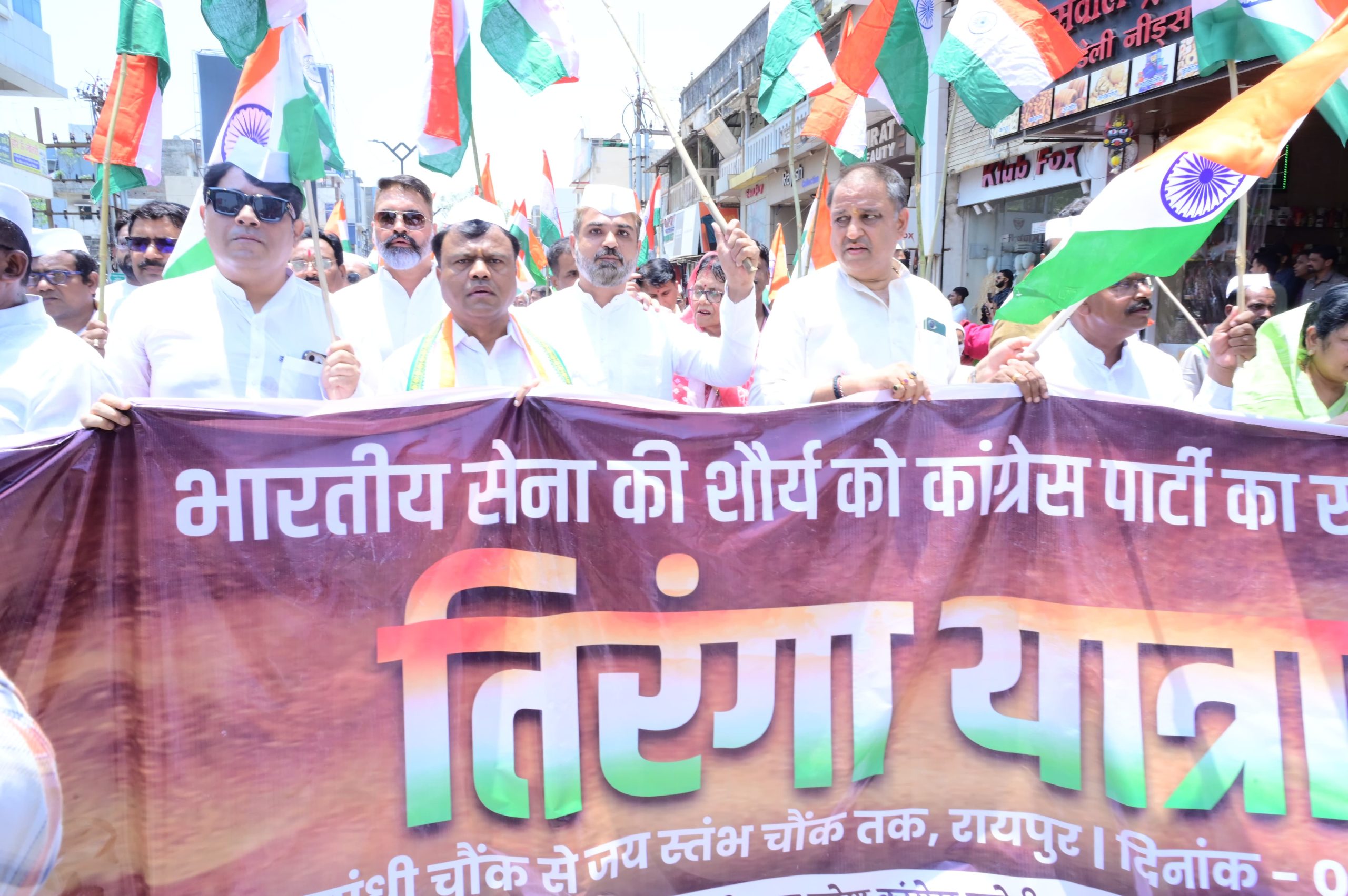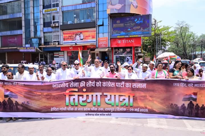 NNH रायपुर/ भारतीय सेना ने पहलगाम आतंकी हमला का मुंहतोड़ जवाब देते हुये आतंकियों के ठिकानों को ध्वस्त किया। सेना ने जो शौर्य साहस वीरता का परिचय दिया है। प्रदेश कांग्रेस ने भारतीय सेना के सम्मान में राजधानी रायपुर के इंदिरा गांधी चौक कालीबाड़ी से जयस्तंभ चौक तक तिरंगा यात्रा निकाली और सेना को सलामी दी। तिरंगा यात्रा में प्रदेश कांग्रेस अध्यक्ष दीपक बैज, नेता प्रतिपक्ष डॉ. चरणदास महंत, प्रभारी सचिवद्वय जरिता लैतफलांग, विजय जांगिड़ सहित कांग्रेस के वरिष्ठ नेता एवं कार्यकर्ता हाथों में तिरंगा झंडा लेकर भारत माता जयकारा लगाते हुये पदयात्रा की।