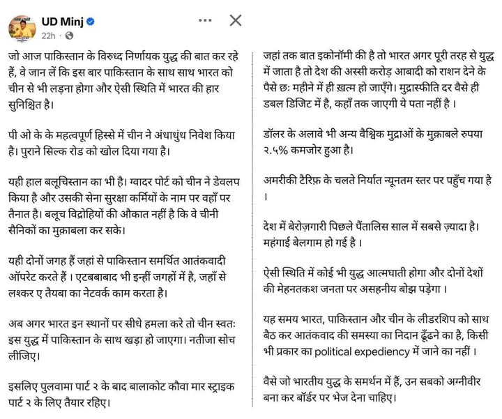 NNH रायपुर/ छत्तीसगढ़ के कुनकुरी विधानसभा क्षेत्र के पूर्व कांग्रेस विधायक यूडी मिंज के फेसबुक पर भारत पाकिस्तान युद्ध को लेकर विवादित पोस्ट की गई है, जिससे बवाल मच गया। मिंज के फेसबुक पर जो पोस्ट शेयर किया गया था, उसमें लिखा गया कि, “आज पाकिस्तान के खिलाफ युद्ध की बात की जा रही है, तो ये जान लें कि इस बार पाकिस्तान के साथ-साथ चीन से भी लड़ना होगा, और ऐसी स्थिति में भारत की हार सुनिश्चित है”