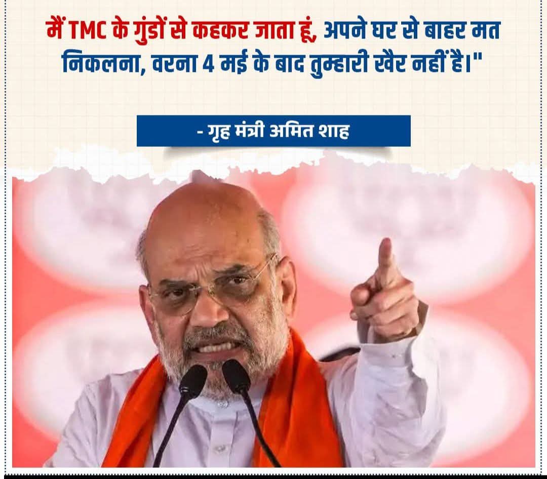 केंद्रीय गृहमंत्री अमित शाह ने पश्चिम बंगाल को लेकर साफ़ चेतावनी दी है, उन्होंने कहा है कि टीएमसी के गुंडों, कान खोलकर सुन लो…”मतदान के दिन घर मे ही बैठना, वरना अंजाम भुगतने के लिए तैयर रहना। साथ ही जनता से अपील की है कि बेखौफ होकर वोट डालें, क्योंकि केंद्रीय अर्धसैनिक बलों की पूरी व्यवस्था की गई है। उन्होंने कानून और सुरक्षा दोनों पर फोकस करते हुए कड़ा संदेश दिया है।