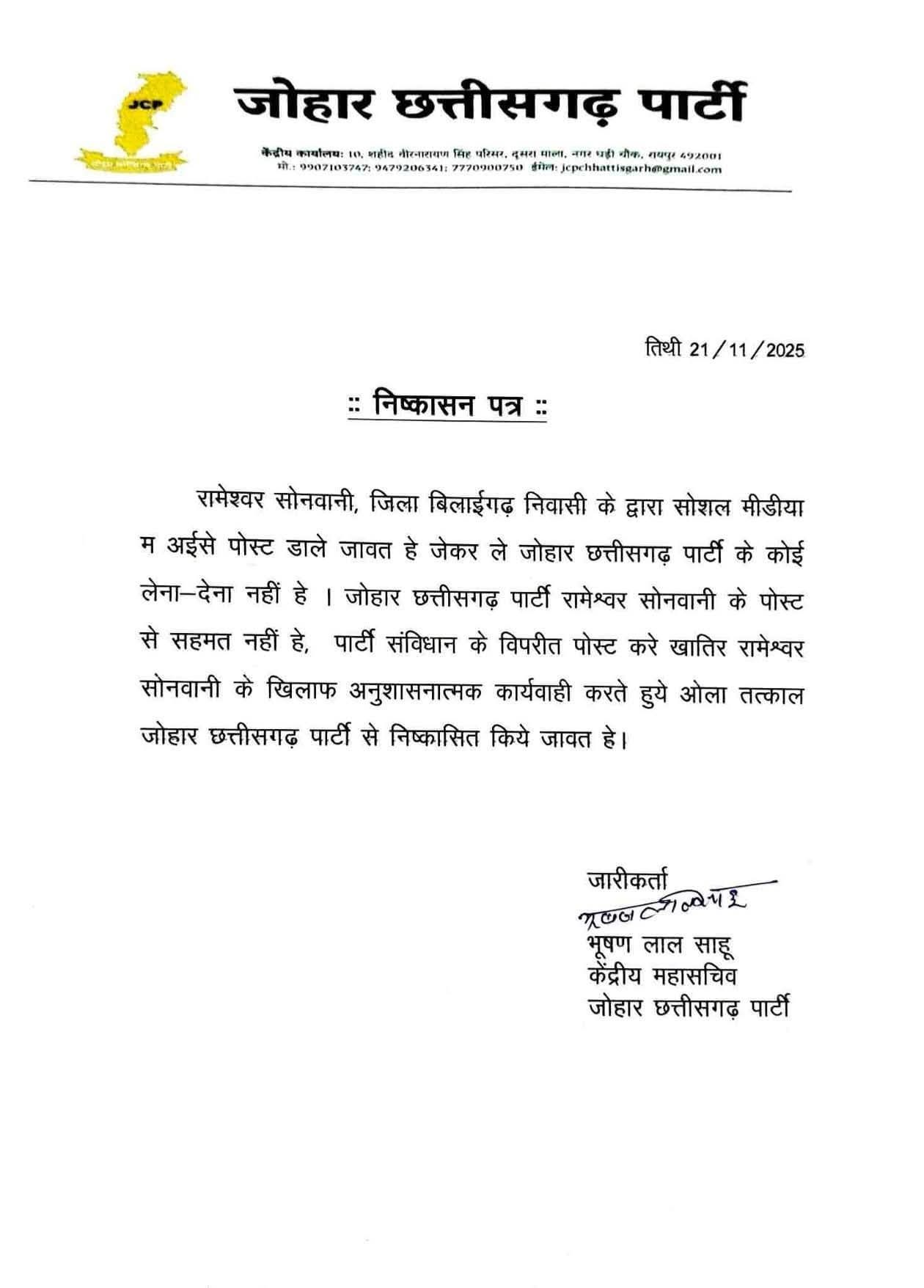 बलौदाबाजार जिला के बिलाईगढ़ से JCP के सदस्य रामेश्वर सोनवानी को निष्कासित कर दिया गया है। निष्कासन का पत्र जारी करते हुए जोहर पार्टी के केंद्रीय महासचिव भूषणलाल साहू ने कहा कि रामेश्वर सोनी ने सोशल मीडिया पर एक पोस्ट किया है, जो कि पार्टी संविधान के विपरीत है। जिसके चलते रामेश्वर सोनवानी को अनुशासनात्मक कार्यवाही कर पार्टी से निष्कासित कर दिया गया है।