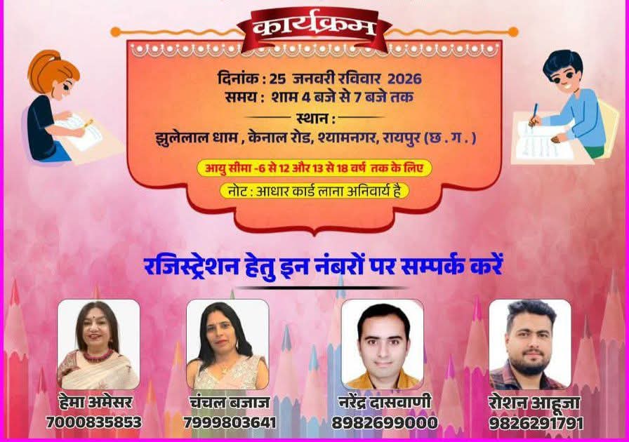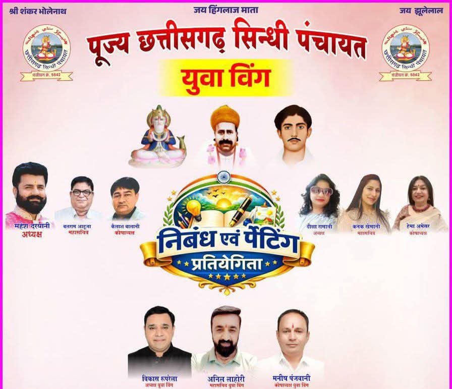 NNH रायपुर/ पूज्य छत्तीसगढ़ सिंधी पंचायत युवा विंग के अध्यक्ष विकास रूपरेला, महासचिव अनिल लाहौरी, कोषाध्यक्ष मनीष पंजवानी ने संयुक्त रूप सेजानकारी देते हुए बताया है कि, सिंधी समाज के बच्चों को धर्म एवं संस्कृति से जोड़ने हेतु द्वारा अमर शहीद हेमू कालाणी शहादत दिवस, वंदे मातरम दिवस एवं गणतंत्र दिवस के उपलक्ष्य में 25 जानवरी 2026 रविवार को झुलेलाल धाम में शाम 4 बजे से सिंधी समाज के बच्चों के लिए युवा विंग द्वारा पेंटिंग एवं निबंध प्रतियोगिता का आयोजन किया गया है।