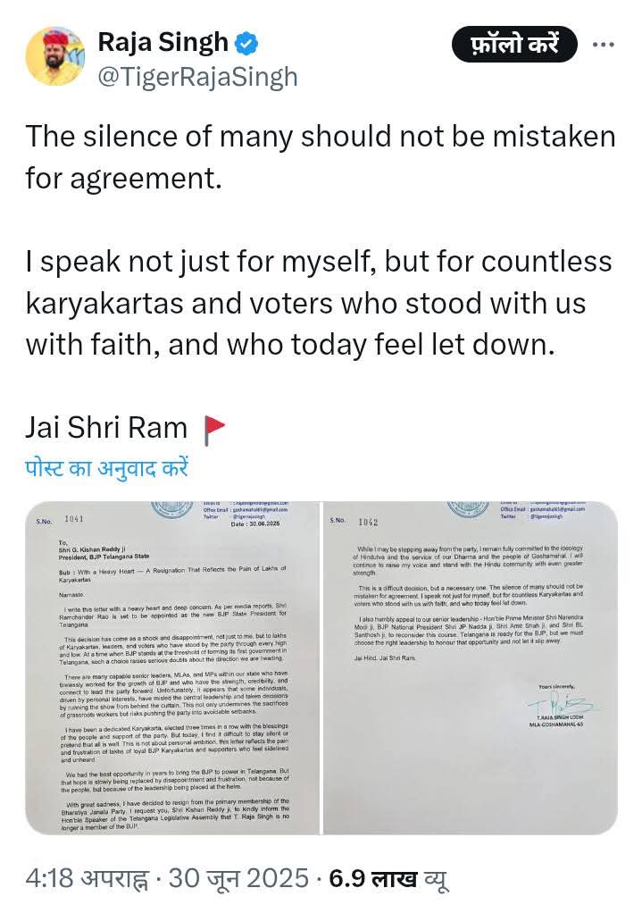 राजा सिंह ने एक्स पर इस्तीफा पत्र साझा करते हुए लिखा, बहुत से लोगों की चुप्पी को सहमति नहीं समझा जाना चाहिए, मैं सिर्फ अपने लिए नहीं, बल्कि उन अनगिनत कार्यकर्ताओं और मतदाताओं के लिए बोल रहा हूं, जो हमारे साथ विश्वास के साथ खड़े थे और जो आज खुद को ठगा हुआ महसूस कर रहे हैं।