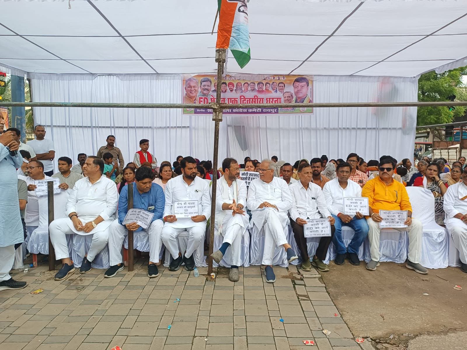 NNH रायपुर/ केंद्र सरकार द्वारा केंद्रीय जांच एजेंसी प्रवर्तन निदेशालय (ई.डी.) द्वारा कांग्रेस नेताओं पर की जा रही कार्यवाही के विरोध में रविवार को शहर जिला कांग्रेस कमेटी रायपुर द्वारा दो दिवसीय धरना प्रदर्शन की शुरुआत की गई। प्रदर्शन का आयोजन राजीव गांधी चौक, रायपुर के सामने किया गया, जो सुबह 11:00 बजे से दोपहर 2:00 बजे तक चला।
