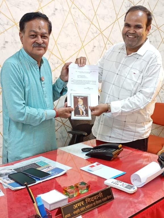 NNH रायपुर/ रायपुर नगर निगम के भगवती चरण शुक्ल वार्ड के वार्ड पार्षद, सांस्कृतिक ,पर्यटन विभाग के अध्यक्ष अमर गिदवानी को सिंध के महाराजा दाहिर सेन की प्रतिमा संत कंवर राम नगर कटोरा तालाब गली नम्बर 1 में स्थापित करने बाबत आज आवेदन दिया गया है। समाज सेवक अमर चंदनानी ने जानकारी देते हुए कहा कि पूर्व में सुशासन तिहार के तहत भी आवेदन दिया गया था। जिसपर आज अमर गिदवानी ने संज्ञान लेते हुए आश्वस्त किया है कि जल्द प्रतिमा स्थापित करने का काम जल्द शुरू किया जाएगा