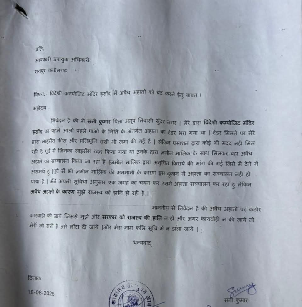 NNH रायपुर/ रायपुर जिले के अंतर्गत मंदिर हसौद विदेशी कम्पोजिट शराब दुकान के पास खुलेआम अवैध आहात संचालित हो रहा है। इस बात की जानकारी टेंडर भरकर आहात हासिल करने वाले व्यक्ति ने एक शिकायत के माध्यम से दी है।