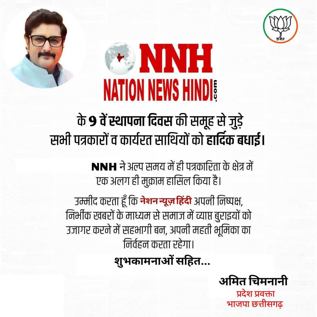 स्थापना दिवस विशेष NNH रायपुर/ डिजिटल मीडिया प्लेटफॉर्म, वेब पोर्टल नेशन न्यूज़ हिंदी www.nationnewshindi.com “NNH” का विजय दशमी तिथि पर आज स्थापना दिवस है। NNH ने 9 वर्ष की यात्रा पूरी कर दसवें वर्ष में प्रवेश किया है। और इस अवसर पर विभिन्न राजनैतिक, सामाजिक कार्यकर्ताओं नेशन न्यूज़ हिंदी शुभकामनाएं दी हैं।