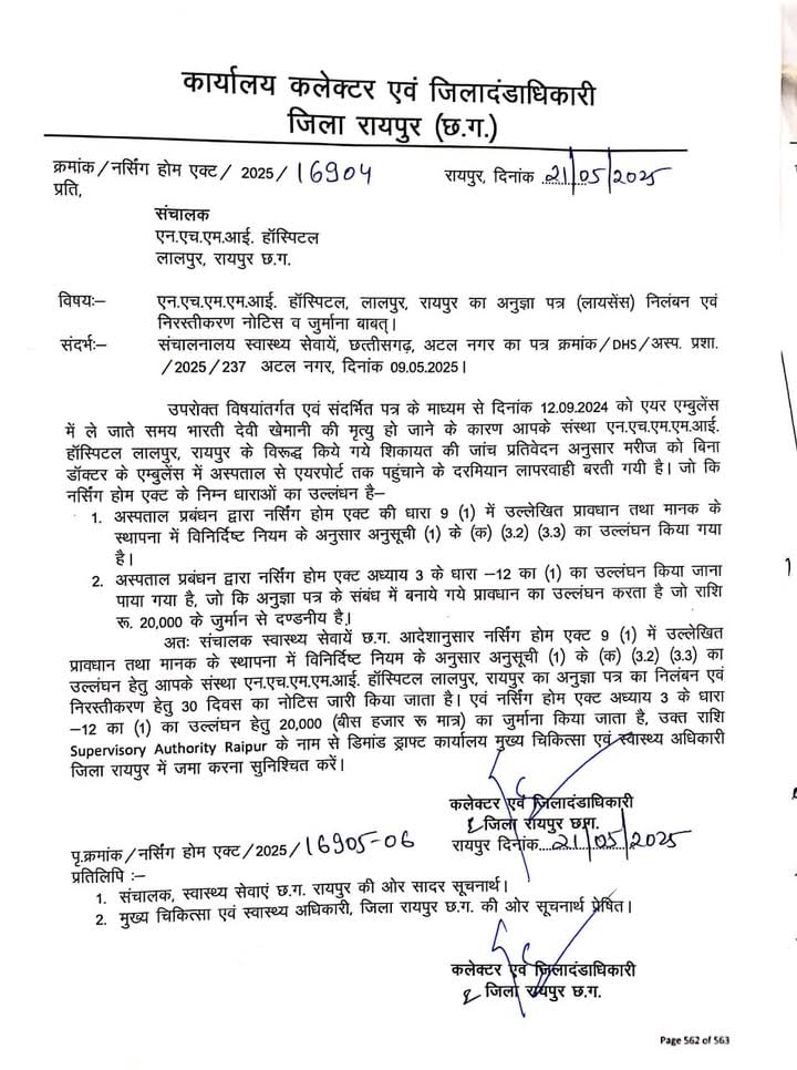 NH-MMI हॉस्पिटल रायपुर पर जुर्माना और लाइसेंस निरस्त करने नोटिस जारी