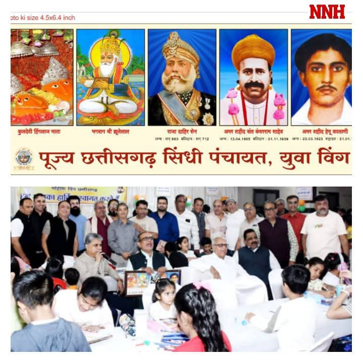 NNH रायपुर/ पूज्य छतीसगढ़ सिन्धी पंचायत युवा विंग के प्रदेश अध्यक्ष विकास रूपरेला, महासचिव अनिल लाहोरी एवम प्रदेश कार्यकारी अध्यक्ष प्रेम प्रकाश मध्यानी ने बताया कि आज के निबंध एवम पेंटिंग चित्रकला के आयोजन में 325 बच्चे शामिल हुए उल्लेखनीय तथ्य यह है कि आज के आयोजन में भगवान झूलेलाल , अमर शहीद हेमू कालाणी , संत कवरराम साहेब पर प्रतिभागियों ने निबंध लिखे और उनके चित्रों की पेंटिंग चित्रकला भी की साथ ही सिंधी समाज के राजा दाहिर सेन की doucumentry भी सभी को दिखाई गई जो कि यश शर्मा के द्वारा बनाई गई है एवम इतिहास की सम्पूर्ण जानकारी भी मंच के माध्यम से दी गई समाज के बच्चों व युवाओं को समाज के इतिहास धर्म व संस्कृति की जानकारी देना व समाजजनों को जोड़ना ही इस आयोजन का मुख्य उद्देश्य था जिसमें आयोजक संस्था पूरी तरह से सफल रही।