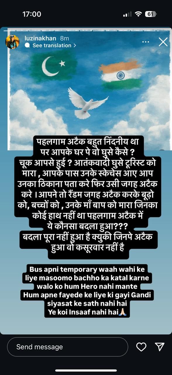 ऑपरेशन सिंदूर के विरुद्ध लुजिना खान ने पोस्ट करके पाकिस्तान से जताई सहानुभूति, रासुका के तहत गिरफ्तार करने की मांग