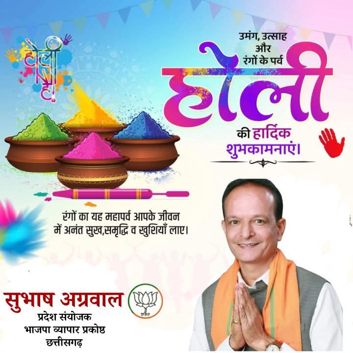 सुभाष अग्रवाल ने आगे कहा कि रंगों के महापर्व होली में आपसी गिले शिकवे मतभेद समाप्त हों, और आप सभी के जीवन खुशियों के रंगों से सराबोर हो मेरी से यह अशेष शुभकामनाएं हैं।
