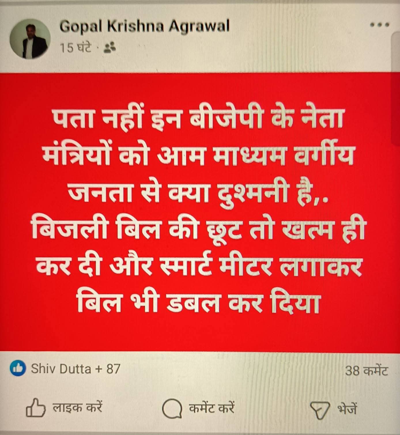 गोपाल कृष्ण अग्रवाल ने अगली पोस्ट करते हुए लिखा है कि, “पता नही इन बीजेपी के नेता मंत्रियों को आम मध्यम वर्गीय जनता से क्या दुश्मनी है, बिजली बिल की छूट तो खत्म ही कर दी, और स्मार्ट मीटर लगाकर बिल भी डबल कर दिया”