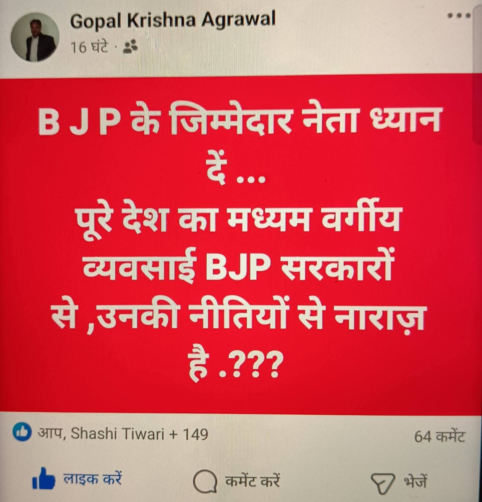 उन्होंने सोशल मीडिया प्लेटफॉर्म फेसबुक पर शनिवार को पोस्ट करके लिखा है कि “बीजेपी के जिम्मेदार नेता ध्यान दें, पूरे देश का मध्यम वर्गीय व्यवसाई बीजेपी सरकारों से, उनकी नीतियों से नाराज़ है”