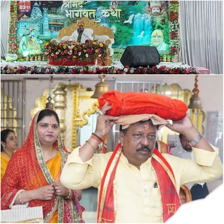 आज प्रातः 8:00 बजे चौबे कॉलोनी स्थित चिंताहरण हनुमान मंदिर से भागवत पुराण के साथ कलश यात्रा निकली। कलश यात्रा चौबे कॉलोनी समता कॉलोनी होते श्याम मंदिर पहुंची। कलश यात्रा में महिलाओं का उत्साह देखते बनता था रास्ते भर महिलाएं भक्ति में लीन झूमते रही । प्रातकाल भागवत कथा के आज के यजमान विष्णु गोयल कन्हैया अग्रवाल और क्षितिज अग्रवाल ने सपत्नीक पूजन, भागवत जी की कथा में छत्तीसगढ़ प्रांतीय युवा अग्रवाल मंच, मारवाड़ी रोमांस रायपुर, सेंटर युवा अग्रवाल मंच महिला इकाई के सदस्यों ने समस्त भक्त जनों से श्याम मंदिर प्रांगण में चल रही कथा में शामिल होकर भगवत गीता का पुण्य लाभ लेने की अपील की है। भागवत कथा एवं शोभायात्रा में नितेश अग्रवाल, नारायण अग्रवाल, त्रिपद जैन, श्रीमती संध्या अग्रवाल, श्रीमती प्रीति अग्रवाल, श्रीमती मीनाक्षी अग्रवाल, श्रीमती किरण गोयल, कमल गुप्ता, आशीष अग्रवाल ,विकास तिवारी, हेमंत तिवारी, संतोष तिवारी, पंकज अग्रवाल, हरीश अग्रवाल, संतोष तिवाड़ी, संतोष बजाज, कैलाश छापड़िया, आनंद अग्रवाल, दीपक अग्रवाल, नारायण अग्रवाल, महेश पोद्दार, सतेंद्र अग्रवाल, सुधीर अग्रवाल, प्रीति क्षितिज अग्रवाल, संध्या अग्रवाल, किरण अग्रवाल, प्रीति प्रमोद अग्रवाल, मीनाक्षी अग्रवाल, सुमन गुप्ता, रेणु अग्रवाल, विभा अग्रवाल, निशा अग्रवाल,बबली अग्रवाल सहित सदस्य गण एवं श्रद्धालु जन शामिल हुए।