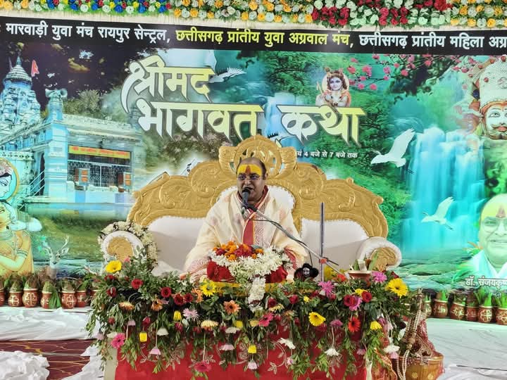 NNH रायपुर/ छत्तीसगढ़ प्रांतीय युवा अग्रवाल मंच मारवाड़ी युवा मंच रायपुर सेंट्रल और युवा अग्रवाल मंच महिला इकाई के द्वारा श्री श्याम मंदिर समता कॉलोनी में आयोजित भागवत कथा के द्वितीय दिवस श्रीमद्भागवत कथा श्रीधामवृंदावन से पधारे पूज्य महाराज श्री डॉक्टर संजय कृष्ण “सलिल”जी के श्रीमुख से आज कथा के द्वितीय दिवस में महाराज जी ने बताया कि मानव देह चौरासी लाख योनियों के बाद प्राप्त होती है, हमें इसे प्राप्त करके प्रभु को प्रत्येक क्षण स्मरण करते रहना चाहिए यह शरीर खाने-पीने के लिए नहीं मिला यह सब क्रिया तो पशुओं में भी होती है, परंतु उनमे विवेक नहीं होता, जन्म लेने का लाभ यही है कि अंत में नारायण की स्मृति बनी रहे, यह लाभ जीवन में अभ्यास से होता है हमें मृत्यु को याद करते रहना चाहिए, जब तक हम अपने खान-पान एवं व्यवहार पर ध्यान नहीं देंगे तब तक हृदय शुद्ध नहीं होगा यहां तक की हृदय शुद्ध होता है वहीं पर प्रभु कृपा करते हैं।