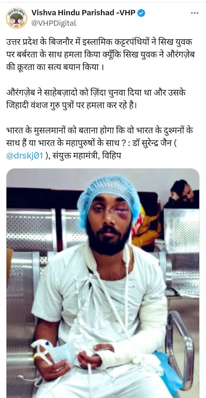 “उत्तर प्रदेश के बिजनौर में इस्लामिक कट्टरपंथियों ने सिख युवक पर बर्बरता के साथ हमला किया क्यूँकि सिख युवक ने औरंगज़ेब की क्रूरता का सत्य बयान किया ।